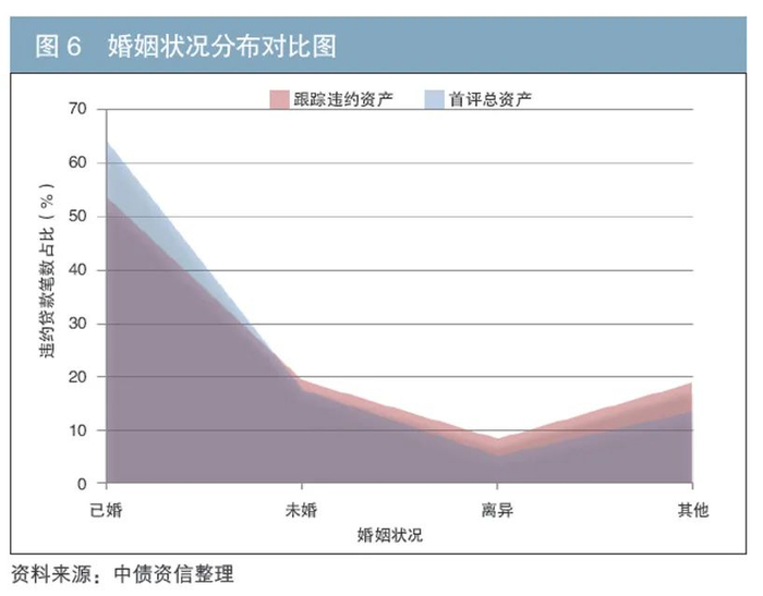 由婚姻状况分布对比图可见,已婚借款人的贷款违约笔数占比较其在首评总资产中的占比有所下降,而处于未婚、离异和其他(包括丧偶等)婚姻状态下的借款人,其贷款违约笔数占比较其在首评总资产中的占比有不同程度的上升。笔者认为,已婚借款人的家庭通常有双份工资收入,偿债能力更有保障,因而发生贷款违约的风险更低(见图6)。