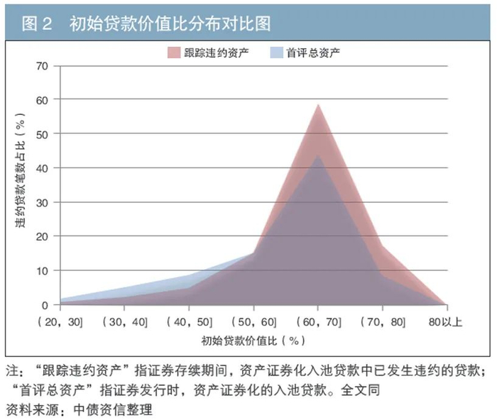 从初始贷款价值比的分布对比图来看,违约资产与首评总资产在初始贷款价值比的分布形态上较为相似(见图2)。但是当初始贷款价值比超过60%时,违约贷款笔数占比明显较高。初始贷款价值比越高,说明该笔贷款的首付比例越低,借款人违约的成本越小,较低的违约成本可能会导致借款人后续违约意愿增强,违约风险由此上升。