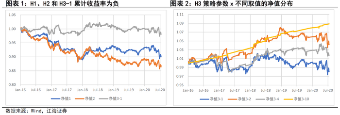 净值表现层面,增强版H3净值收益明显好于H1和H2,其中H1、H2和H3-1的累计收益率为负。具体而言,H1、H2均为日内单边单笔开仓交易,累计收益率自回溯起始终保持在负值区间,足见日内单边交易的风险暴露之高,另一方面虽然H3-1累计收益率也为负值,但整体要好于H1和H2,表明日内短期交易中,均值复归的逻辑具备一定的参考价值,但回归的中枢并不能完全依据其估值而定,增加交易边际的“安全垫”很有必要。