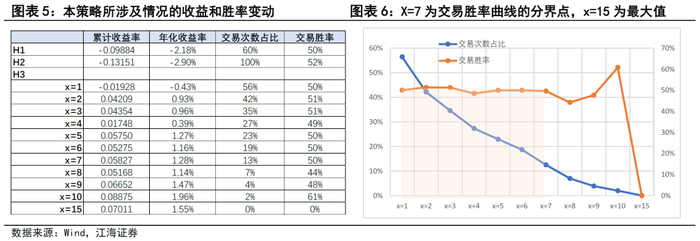 H3为增加安全边际的日内多空交易操作,安全边际设定越高,日内交易次数占比越少。交易胜率方面,有三个理解:(1)x取值1-7之间基本属于可实践区间,交易胜率相对稳定在(49%-51%),符合概率统计规律,尤其当x取值为2或3时胜率相对较高。(2)当x超过7后,日内的交易机会已然大大减少,此时x设定越高,安全垫越厚,交易的胜率则越大。当x取值为10时,交易胜率超过60%,这种情况实际中比较少见,一旦出现就是波段操作的机会。(3)x取值为15的交易机会约等于0,可视为安全边际设定的最大值。