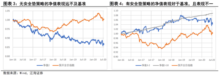 有安全边际的价格偏离策略能够实现增厚账户收益的目的,但不同市场环境的表现差异较大,熊市以减少交易频次+增加安全边际的方式为宜,牛市日内交易策略表现一般。我们选取国开全价指数作为基准,进而对比净值2、净值3-2和3-10策略曲线,可以发现:(1)在没有安全垫的情况下,两头开仓交易都无法阻止亏损,因此净值2曲线完全跑输基准线。(2)在设定安全垫的情况下,日内价格偏离策略能够跑赢基准,同时设定2bp安全垫的曲线更加平稳,波动率为2.35%,控制风险的同时能够增厚收益。设定10bp安全垫,净值曲线看似能够对冲市场波动,但背后体现的操作思路是低频交易,在安全垫十分充足的情况下进行日内交易。熊市中策略收益涨幅较快,牛市收益反而下滑,本质上是由于熊市中交易减少,持有现金出回购抵抗市场下跌。