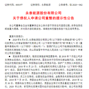 8月7日晚间,永泰能源(600157.SH)公告称,因债权人河南省豫煤矿机有限公司以公司不能清偿到期债务且明显缺乏清偿能力为由,向山西省晋中市中级人民法院申请对公司进行重整。