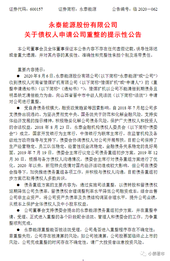 据悉,永泰能源在债委会指导下,加快推进债务重组各项工作,并积极与债权人沟通,目前债务重组初步方案已取得债权人多数共识。