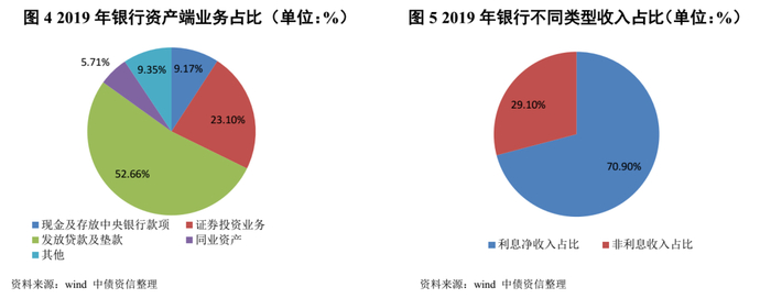 贷款指商业银行作为贷款人按照一定的贷款原则和政策,以还本付息为条件,将组织到的货币资金以一定利率提供给借款人使用,并到期收回本息的一种资金运用形式,是商业银行利息收入和利润的主要来源之一。贷款的流动性最差、资本占用最多,其信用风险主要来自贷款的回收风险,与银行的内控管理体系、信贷和授信评审政策、主要客户信用资质、风控标准和措施以及呆坏账处理方式等多种因素息息相关。在表内占比方面,根据中债资信选取的232家样本银行2019年数据,银行业信贷资产占比约为52.5%(如图4)。营收结构方面,我国银行利息净收入占营收比重约70%(如图5)。因此,无论是从业务占比还是经营风险角度来讲,贷款业务都是商业银行经营的重点,也是投资人关注的重点。