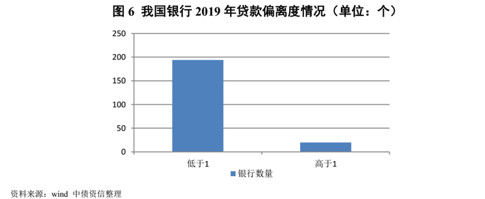 以偏离度=逾期90天以上贷款/不良贷款计算,根据中债资信选取的232家样本企业中披露不良率和逾期三个月以上贷款占比数据的214家企业,2019年偏离度低于1的银行有194家,偏离度高于1的银行有20家(如图6)。从上述数据可以看出,在监管要求下,多数银行偏离度已经满足监管要求,但仍有部分银行偏离度大于1,预计未来会调整不良率,进而拉高行业平均不良率。