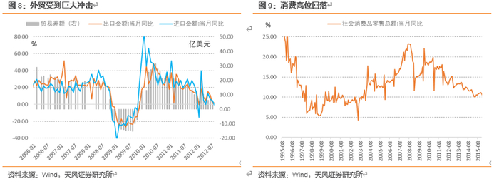 2008年金融危机之后,最先受冲击的是外贸,出口同比降幅高达20%;消费从高位快速回落,制造业投资亦受到明显冲击;GDP增速从二季度10.9%跌落至年底7.10%,2009年一季度再度跌至6.4%的低位。