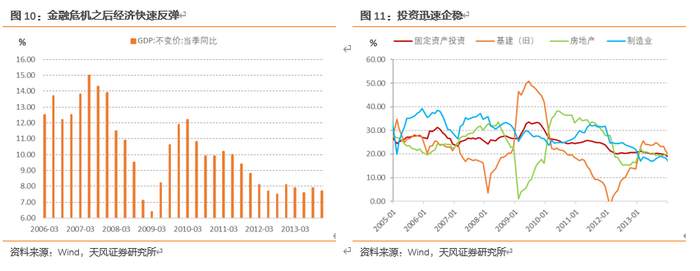 一系列强刺激措施下,经济快速底部反弹,2009年年初基本已确认经济触底,到三季度GDP增速回到潜在增速水平(约10.2%)之上。
