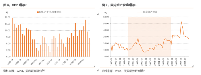 政策强力刺激之下,1998年四季度GDP增速大幅回升至9.10%,随着财政刺激效应减弱,经济再度下行,一、二季度GDP增速回落至8.90%、7.90%,再度降至潜在增速之下。受制于国企改革、国有银行改制、三角债、地方财政困难等一系列问题,GDP增速一直在潜在增速附近徘徊。直到2003年以后,国企改革、银行改制、经济结构转型,中国加入WTO出口企稳,同时开启一轮投资热潮,经济才明确回到潜在增速之上。