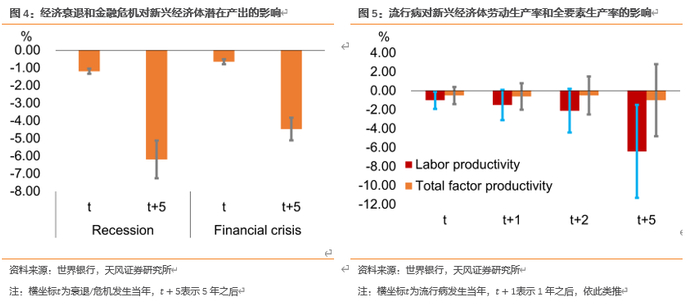 对于本次疫情,世界银行在6月发布的《全球经济展望》中明确指出,金融风险上升、国际油价大跌(针对产油国)对新兴市场国家中期潜在产出造成拖累,同时疫情带来的人力资本损失、供应链扰乱、投资不确定性上升、储蓄意愿增加等降低整体的生产率。