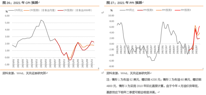 货币政策可能会继续稳健适度,但幅度可能还是比较温和。对于明年而言,全球经济复苏下国内经济预计会回升至潜在增速附近,考虑到政策较早地关注稳增长和防风险的平衡,预计难以出现明显的经济过热局面;同时,根据我们的测算,虽然疫情之后全球大放水与次贷危机之后很相似,但由于国内逆周期政策力度、货币供给、猪周期、原油供需格局、就业形势、通胀预期等都有明显不同,因而大概率不会重复2010-2011年大通胀路径,CPI、PPI趋势向上,但整体相对温和,2012年CPI大概率在3%甚至2.5%以内,PPI预计在3%-4%,当然由于基数较低二季度会短暂上行。