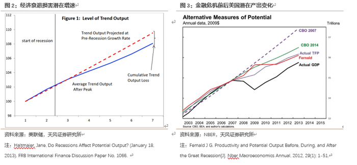 虽然潜在增速是一个长期变量,但是越来越多的研究表明,短期的经济衰退也会对潜在增速造成损害。例如美联储的研究论文《DoRecessions Affect Potential Output?》表明经济衰退可以通过减少人均资本存量、降低劳动参与率等渠道损害潜在产出,特别是对发达国家影响尤为明显。OECD的工作论文《The Effect of the GlobalFinancial Crisis on OECD Potential Output》指出金融危机导致整体OECD国家潜在产出下降2.75%,其中发生过银行业危机的19个国家降幅3.75%。2012年伯南克在演讲中也表示全球经济危机确实降低了潜在增速。此外,NBER、BIS、世界银行等相关研究中均有类似的结论。