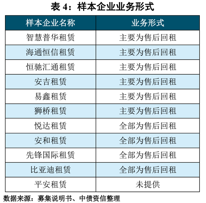 业务形式方面,汽车融资租赁公司多以售后回租[5]为主,业务形式单一,同质性高。中债资信梳理了11家样本企业提供的资产池发现,提供业务形式占比的样本企业其业务形式均以售后回租为主,直接租赁的业务形式占比很低。