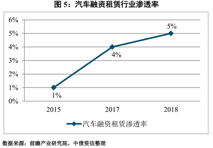 从渗透率角度来看,渗透率自2015年以后有着明显上升但与国外汽车融资租赁渗透率还有一定差距。2015年之前汽车融资租赁行业的渗透率仅为不到1%,2015年之后渗透率保持较高的涨幅,截至2018年汽车融资租赁行业的渗透率已经达到5%左右。由于渗透率表示购车人对汽车融资租赁行业的接受程度,渗透率的快速提升说明近年我国购车人对汽车融资租赁的接受程度在不断提高。