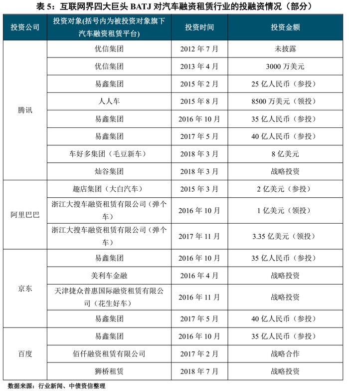 2016年起,BATJ作为互联网领域的投资风向标,开始大规模在汽车融资租赁行业布局。阿里巴巴旗下蚂蚁金服于2016年参投浙江大搜车融资租赁有限公司(简称“大搜车”)C轮投资,大搜车于当年推出汽车融资租赁服务品牌“弹个车”。2017年,阿里巴巴再次领投大搜车E轮融资,并参投大搜车2018年F轮融资。百度于2016年参投易鑫租赁B轮融资,于2017年与佰仟融资租赁有限公司达成合作,于2018年战略投资狮桥租赁。京东分别于2015年和2016年两轮参投易鑫租赁,于2016年战略投资美利车金融并于同年参投天津捷众普惠国际融资租赁有限公司旗下品牌“花生好车”。腾讯分别于2015年、2016年和2017年参投易鑫集团A轮和C轮融资,并于2018年战略投资上海有家有车融资租赁有限公司控股股东灿谷集团。BATJ在融资租赁行业的大规模布局使得汽车融资租赁行业进入了崭新的一页。