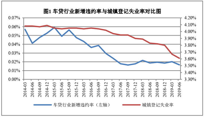 宏观经济环境主要通过作用于居民收入,影响借款人的还款能力,从而影响汽车贷款的违约表现,且这种影响是系统性的。城镇居民失业率和城镇居民收入可支配收入可以一定程度上反映借款人的还款能力。在汽车行业竞争加剧的背景下,行业的销售周期和促销政策与汽车贷款违约表现有一定的相关性。基于此,本文对比了城镇登记失业率、城镇居民人均可支配收入、汽车行业乘用车产销量与汽车金融行业贷款违约率表现[1]的变化情况。
