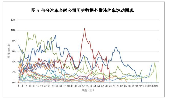 汽车金融公司的股东背景、经营年限、贷款规模等能在一定程度上反映公司把控贷款审批风险的经验及能力,而不良率能真实反映发起机构的风控表现。从股东背景和经营经验来看,根据公开披露数据,截至2018年底,外资、合资、内资汽车金融主体[2]的不良率均值分别为0.18%、0.31%、0.60%,外资公司可以借鉴母公司丰富成熟的行业经验、先进完善的风控系统,具有较强的风控能力,但内资企业不良率也呈现明显的分异,不乏一些内资企业通过长期的经营积累,对国内汽车贷款市场的理解更深入,能更准确评估风险。从贷款规模来看,规模在500亿元以上及不足500亿元的汽车金融机构的2018年底不良率均值分别为0.16%和0.50%,贷款规模较大的发起机构往往具有更强的资本实力和经营经验,其不良率处于较低水平。从历史数据违约率表现来看(见图5),违约率均值水平及波动程度的分化与不良率水平的分化表现相近,说明风控能力相对较低且稳定性较差的汽车金融公司,贷款违约表现较差。