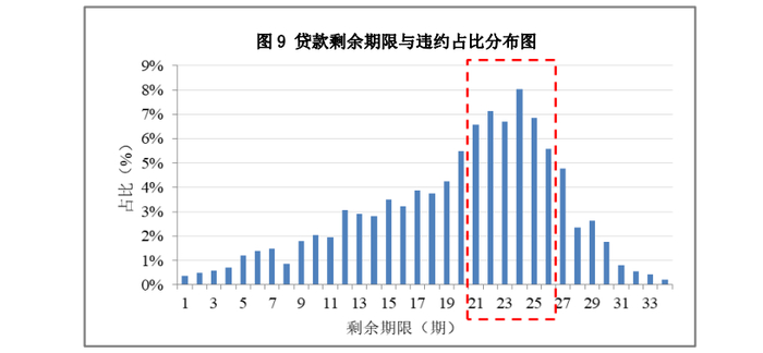 合同期限越长的贷款越可能违约,贷款账龄1年左右是违约高峰期,相对应的,剩余期限2年左右达到违约高峰。从合同期限来看(图7),违约贷款中36期合同期限的贷款占比明显增大,较初始资产池分布增加了约20%。分析认为,一方面样本数据中借款人为中低收入人群,选择长合同期限的借款人偿债能力较弱,而还款周期越长,借款人收入不确定性越大,相应的未来还款的不确定性越大。从账龄和剩余期限来看(图8、图9),在违约贷款中,当账龄处于10-15期时,相应的剩余期限处于21-26期时,贷款违约概率明显增大。分析认为,样本数据中的汽车大多属于中低端品牌,汽车贬值速度较快,当账龄在1年左右时,借款人偿债意愿可能有一定程度的降低,并且此时的违约成本并未处于高值,进一步增强了借款人的违约倾向;再者,部分借款人存在冲动型贷款行为,在还款前期可能因无法承担购车后的日常开支而导致偿还能力下降,出现违约行为。