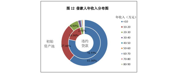 低收入的借款人更容易违约。从借款人收入分布图来看(图12),违约贷款中年收入低于10万元的借款人占比近80%,超过初始资产池中占比约17%。但是所选贷款样本的发起机构主要集中于中低端品牌汽车,因此面向客群主要集中于中低收入消费者,考虑到样本数据存在一定的偏差,收入差异对汽车贷款违约的影响还有待于进一步分析。