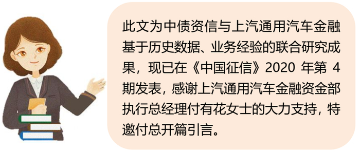 大家好,我是上汽通用汽车金融有限责任公司资金部执行总经理付有花。此次我部门与中债资信评估有限责任公司结构融资总部联合撰稿《个人汽车贷款违约影响因素探究》一文,我深感荣幸。我们将公司历史存量数据与中债资信团队进行共享,从宏观因素、主体因素和资产因素三个维度对影响汽车贷款违约的因素进行分析研究,希望能够为行业从业者和广大投资者提供借鉴。