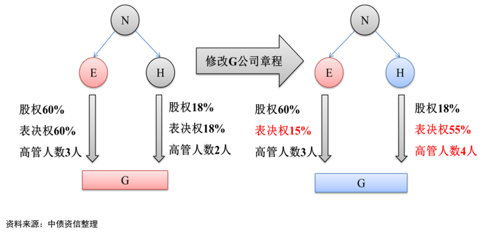 2、名义上出表,但实际控制下属企业。这一类控制权问题可以通过股权比例与表决权占比不对等来实现。《公司法》规定,股东会会议由股东按照出资比例行使表决权,但是,公司章程另有规定的除外。公司协议约定框架下,很多公司为了实现对财务报表的优化,往往突破传统规则,使得股权比例高于或者低于表决权。常见情况包括:(1)财务投资人,双方协议约定财务投资人不参与企业经营管理决策、股权比例远低于其表决权,以获取公司分红为目的持有公司股权。(2)直接修改公司章程,约定股东持有的表决权、董事会任命权限等。例如,集团N下属E、H多个子公司,其中E公司为发债企业,E公司持有子公司G60%的股权,对G公司进行合并报表处理。由于G公司债务负担较重,为优化E公司报表,E公司修改公司章程,约定原大股东之一H公司(亦为关联方)的表决权调升为55%(其持股比例为18%保持不变);另外董事会成员由5人增至7人,其中H公司派出董事会成员有2人增至4人,由此H公司董事会席位过半数(4/7)。通过这样的处理,E公司既实现了减轻报表层面负担的目的,同时集团N并未丧失对E公司的控制权。但务实中,E公司依然需要承担出表子公司的管理职责、债务担保或偿付。一旦该公司发生流动性问题,仍将直接影响E公司信用水平。
