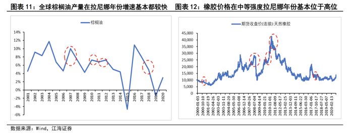 与给太平洋东海岸带来的干旱不同,拉尼娜会给澳大利亚、亚洲东南部大部分地区和中国带来大量降雨,使得东南亚棕榈油第二年的产量增加,但会对橡胶、铁矿石造成不利影响。而南非则可能出现更多的降雨,有利于南非的玉米、蔗糖的生长。