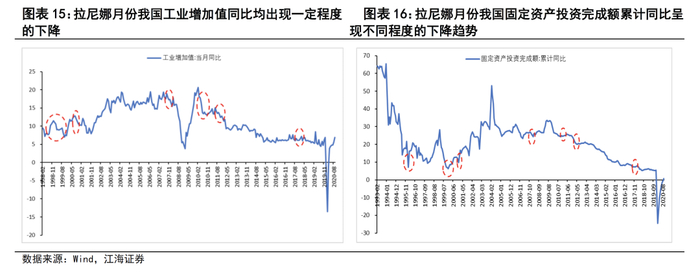 拉尼娜现象还会对我国的工业生产、投资等方面造成影响。拉尼娜现象导致我国大部分地区低温,部分地区还伴随着异常降雨,不利于基建、房地产投资。这些都将减缓疫情冲击下经济复苏的步伐。