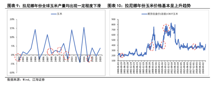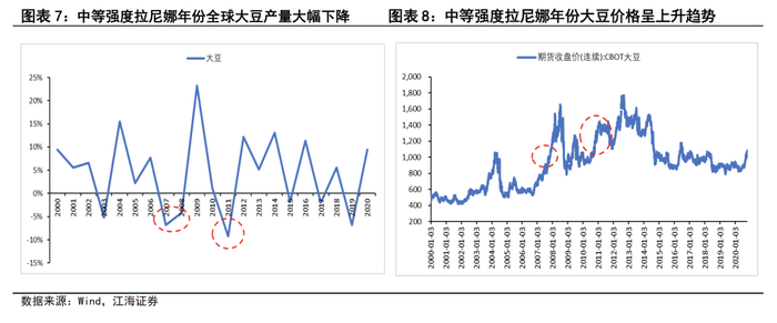 从地区来看,拉尼娜可能会给美国、阿根廷、巴西南部地区带来干旱及次年的低温,不利于玉米、大豆生长和收割,造成这些作物减产,价格提升。例如,于2010年发生的中等强度拉尼娜现象,导致美豆较上年度减产1.2%、巴西大豆较上年度减产14.5%、阿根廷大豆较上年度减产14.8%。