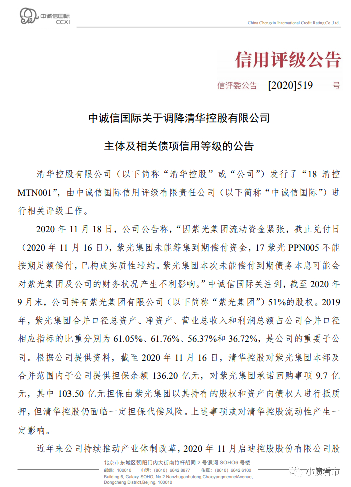紫光集团爆雷,母公司清华控股受到牵连,其不仅面临担保代偿风险,还被评级机构下调评级。