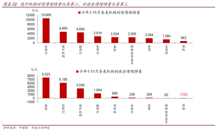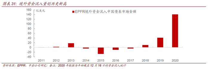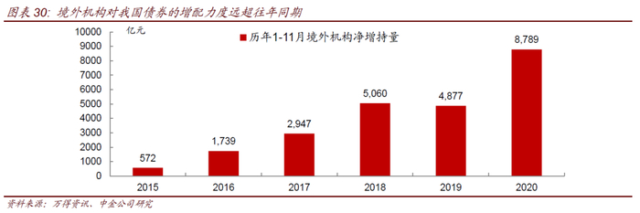 今年境外机构对我国债券的增配力度为历史之最。今年前11个月来看,境外机构累计增持高达8789亿元境内债券,增持规模几乎是2018、2019年同期的2倍,更是大幅高于往年同期。从EPFR统计的基金资金流向来看,境外基金资金流入的增幅则更高,2020年截至目前为止,所有基金合计流入中国债券市场的资金量已经超过2019年的3倍,远超历史任何一年的规模。境外机构的大举增持,使得境外机构这一群体已经成为我国债券市场影响力最强的机构类型之一。今年前11个月来看,境外机构的国债增持规模位居所有机构类型中的第二,增持规模仅次于全国性商业银行;同时对政金债的增持在各类机构中也位居前三。