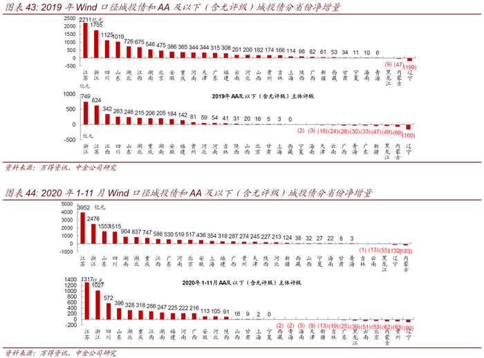 2)低评级城投信用债净增为负的省份2020年1-11月进一步增加,东北地区、青海、云南、贵州等地低评级城投净融资为负意味着市场进行的低评级城投下沉也仅局限于江苏浙江等经济发达省份
