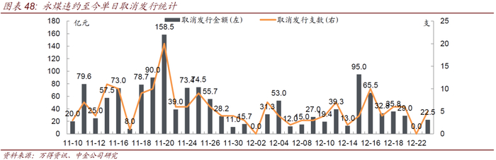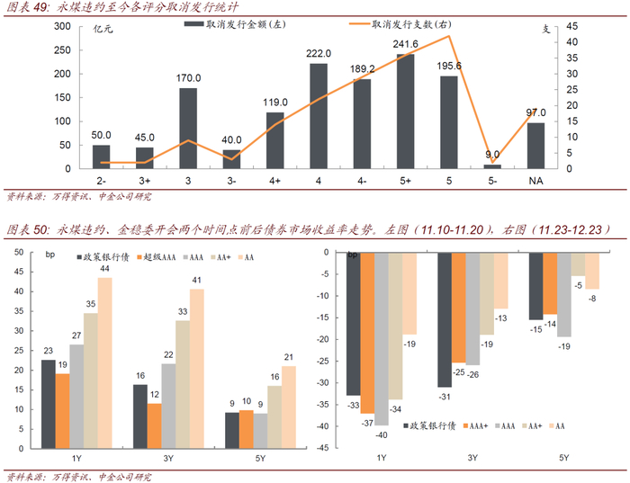 综合以上情形,永煤事件一石惊起千层浪,暴露出国企信用风险上升、投资信用债风险收益不对称、投资者择券逻辑受到挑战、投资者保护制度亟待加强等诸多问题,导致市场风险偏好剧烈收缩,随之而来的是机构风控入库标准上移和相关投资基金和资管产品因净值下跌赎回压力上升而引发新一轮的流动性危机,市场风险进一步发酵,表现为一级取消案例迅速增多,二级多家弱国企被大幅折价抛售,区域和行业上集中在河南、山西、河北的煤企,并且蔓延到云南、天津的弱国企和城投;同时,体现为更为明显的信用分化,取消发行显著集中在中金评分4和5档主体,显示低等级需求走弱更明显,二级方面评级间利差有明显走扩。