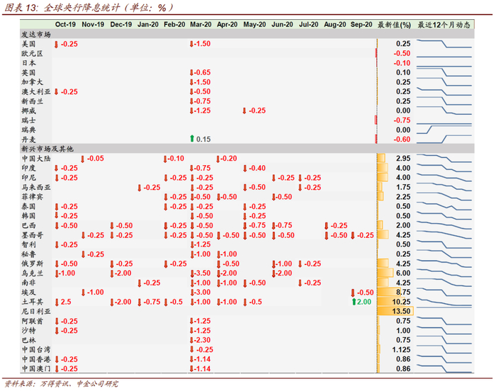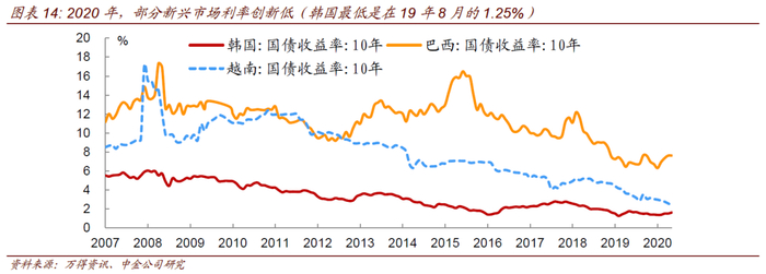 不只是美国,疫情引发各国央行从3月份开始加大了降息力度,不少国家都是将基准利率降至历史新低,带动部分新兴市场国债收益率创历史新低。利率水平的下降对经济和风险资产的提振比较明显。