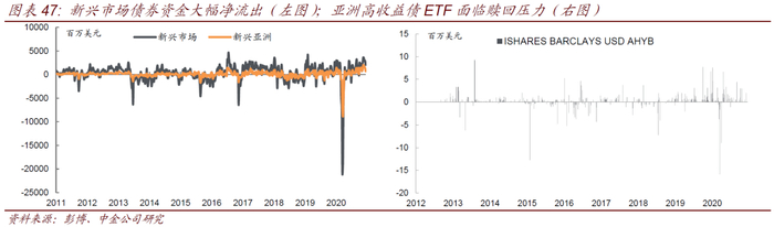 回顾波动最大的3月份,因海外疫情加速升级,全球风险偏好急剧下行,风险资产抛压严重,同时美元升值,美元流动性趋于紧张。从Libor-OIS走势看,3月份已上升至2010年以来的最高水平,美元与主要币种货币互换点数明显下滑,反映市场的美元流动性整体较紧。在美元升值压力、风险偏好下行、美元荒等多重打压下,资金开始大幅流出新兴市场。根据EFPR数据,资金流出新兴债券市场规模已经创下2008年4月以来的最高幅度,同时ISHARES BARCLAYS 亚洲高收益美元债ETF也显示资金加速撤出。因美元流动性稀缺叠加资金撤出、基金赎回压力,中资美元债市也进入加速下跌的螺旋。