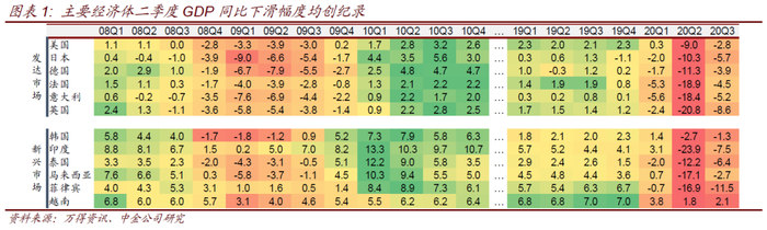 新冠疫情的爆发使全球经济迅速陷入大幅度衰退,IMF在10月的世界经济展望报告中预计,2020年全球GDP可能下降4.36%,而在全球金融危机后,2009年全球GDP也仅下滑0.08%。在疫情爆发初期,美国、日本、德国、法国、英国等主要发达经济体二季度GDP分别创纪录下降9%、10.3%、11.3%、18.9%和20.8%,衰退程度和速度远大于金融危机时,韩国、印度、泰国、菲律宾等新兴经济体二季度GDP也同样出现纪录以来的最大降幅。但与此对应,由于新冠疫情对经济的冲击更多是由于各国的封锁措施对经济造成了人为的抑制,因此在各国陆续解封后,经济的恢复速度也快于金融危机时。