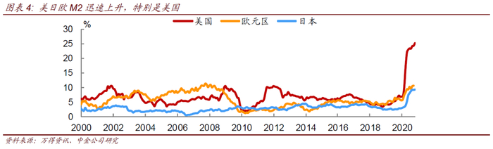 新冠疫情爆发后美联储连续两次降息、迅速重启QE并开启“无限量”模式。2020年3月,美联储连续两次紧急降息,将联邦基金目标利率从1.50%大幅下调150bp至0。虽然从降息次数和幅度来看,此次降息力度不及金融危机时期连续9次降息450bp,但实际上同样将联邦基金目标利率压至0~0.25%的零利率区间。在美联储不考虑实施负利率的情况下,已经将其货币政策空间发挥到极致。2020年3月15日,美联储宣布启动7000亿美元 QE,并自3月16日开始在未来几个月至少购买5000 亿美元国债和2000亿美元MBS。3月23日,美联储宣布取消QE限额,按照“实际需要”购买资产,开启无限量 QE。美联储资产负债规模快速扩张,截至12月20日,美联储资产负债表规模为7.41万亿美元,在2月份4.2万亿美元的基础上进一步扩大了3.2万亿美元;而在金融危机时期,2010年末美联储资产负债表规模只比2008年8月时的0.95万亿美元扩大了1.5万亿美元。此外,美国M2同比也创下历史新高,从2月的6.81%一路大幅攀升至11月的25.07%,远超此前13.81%的高点。