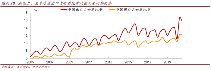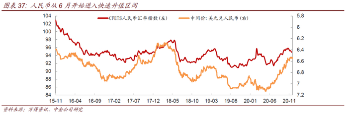 另一方面,我国生产快于消费恢复,贸易顺差创09年以来新高,推升人民币汇率不断走强,进一步增强了中国债券的吸引力。勤劳节俭的中国人在经济受到冲击之后,首先做的是努力工作并且省吃俭用,这就造就了中国生产恢复快于消费,形成了中国生产-海外消费的链条,使得今年贸易顺差创2009年以来新高。全球尤其是以欧美为首的国家的消费者在财政的救助下,购买了比以往更多的中国商品,二三季度以来中国出口占世界的份额均创历史同期新高。出口的走强推升了人民币汇率二季度以来不断走强,从人民币兑美元中间价来看,人民币兑美元最新价格为6.54(12月24日中间价),较5月末升值超过8%,已经大幅超过2019年高位;人民币对一篮子汇率的指数CFETS自5月末以来也升值超过3%,高点也超越了2019年。人民币汇率尤其是人民币对美元升值的速度和幅度,目前已经接近2017年。人民币汇率的不断升值使得投资中国债券市场不仅能够获得高额的票息,还能获得可观的汇兑损益,进一步增强投资中国债券市场的吸引力。
