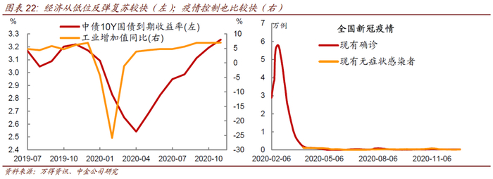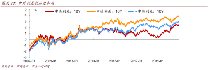 今年这一历史之“最”,与中国债券吸引力也达到历史之“最”息息相关。一方面,疫情导致的中国与海外经济的“割裂”前所未有,从而带来中国和海外的利率联动的纽带比以往更弱,中外利差创历史新高。虽然中国同样遭受了百年一遇的疫情创伤,但中国疫情防控得力,经济率先从疫情的“深坑”中恢复,宽松货币政策也随之率先全球退出,因此中国的利率也是率先全球回升的,利率回升至甚至高于疫情之前的水平;但海外仍然在抗击疫情,部分国家疫情甚至在不断恶化,使得美联储、欧央行等主要海外央行需要持续宽松支持经济,从而导致海外利率不断创新低。以往,在没有疫情的情况下,世界经济是相互联系的,中国与美国这样的大国复苏往往会带动全球共振复苏,2017年就是这样的故事。在全球经济联系紧密的情况下,复苏的共振也会带动利率的同步变化,使得国家之间的利差会维持在一定区间之内。但疫情打断了经济的共振纽带,各国经济是否能够恢复要更大程度上取决于其自身疫情防控的情况,而并不是合作伙伴的业务订单能够带来的。因此,各国的利率走势也更多取决于此。在海外与中国疫情防控成绩的巨大差距下,中国与海外利差也就突破了这个波动区间,创了历史新高。