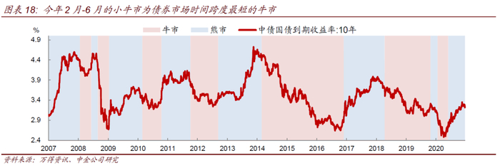 如果统计2007年以来每轮牛市和熊市的时间跨度,以10年国债到期收益率作为基准,当收益率从高点下降30bp记为进入债券市场牛市的信号、从低点上行30bp记为进入熊市的信号,可以看到今年债券市场迎来了时间跨度最短的牛市,牛市持续的时间跨度仅有85个交易日(2020年1月23日至2020年6月1日),打破了此前2008年次贷危机时期的记录(94个交易日)。这种快速的牛熊切换也将投资者打了一个措手不及,有的投资者由于没有及时离场,导致浮盈变浮亏,可谓悲喜交加。