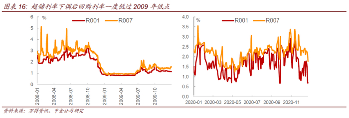 实际上疫情发生以来,货币政策迅速做出反应为市场注入流动性,因此隔夜利率曾一度接近0.72%的超储利率下限。因此此次央行下调超储利率,可能也有顺应市场情况引导降低资金利率的意图。央行此次顺应市场情况下调超储利率,有利于打开利率走廊的下限。此前由于资金利率和超储利率之前存在较大利差,下调超储利率对于引导资金利率下行的作用不大,因此此前市场多参考OMO利率作为利率走廊下限。但今年疫情之后,货币政策转向宽松带动资金利率明显下行,隔夜利率多次触及超储利率水平,OMO利率作为利率走廊下限的作用失灵,利率走廊的实际下限为超储利率。因此,此时央行顺势下调超储利率,有利于打开利率走廊的下限。而同时央行也多次下调了OMO和MLF利率,因此实际上利率走廊的中枢也已经整体下移。