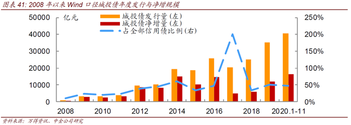 1)2020年1-11月城投债发行和净增规模分别达到4.07万亿元和1.64万亿元,是2008年以来的历史最高峰