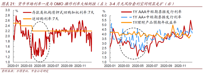 之所以说市场的解读过于乐观,是因为市场更多专注于对央行此次操作对价格的影响,却忽视了央行对量的引导。从当前时点回溯来看,央行彼时进行下调利率的操作,目的更多是在于引导银行减少超额存款准备金的存放,鼓励银行将这部分钱投入实体,来对冲疫情对经济的拖累,是一种以“价”引“量”的操作,通过“宽货币”实现“宽信用”。央行似乎并没有想进一步引导货币市场利率下行,至少不是大幅下行,毕竟央行是可以通过(实际中也是一直通过)公开市场操作利率,来引导货币市场利率的走势。而央行自3月30日将7天逆回购利率下调至2.2%后,便再也没有对其进行进一步的下调。这种偏差也带来了三个后果。一是市场对“宽信用”预期不足,进而导致低估了“宽信用”对后续实体经济复苏的提振作用。二是市场对后续“宽货币”的持续性过于乐观,导致加杠杆行为增多,为后面债市调整埋下了隐患。三是投资者对货币市场利率预期压低,进而带动整个债市收益率处于偏低的水平,尤其是票据贴现利率和信用债发行利率,一直维持在低位,也进而导致了违规套利等行为产生,成为后续监管入场的导火线。
