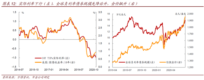 降息对海外债市影响深远,短端美债利率历史上第一次转负、长端创新低。3月降息后,美债收益率加速下行,2Y美债从1.4%下行至0.2%的中枢,就再也没起来;10Y美债从1.6%下行至3月9日的0.54%的最低点,此后因为流动性危机稍有反弹。更短端的例如3M美国国库券利率甚至进入负利率区间。美国之外,发达市场利率进一步变负,例如10年德债收益率在3月9日达到-0.85%、2年德债在3月12日达到-1.02%,均为历史最低值。但当流动性危机过去后,短端德债基本恢复至3月前的利率水平,德债利率呈现探底回升,而短端美债还在低位。值得注意,美联储是被迫跟随市场选择降息的。美债在3月3日降息之前就开始下行,从2月14日至3月2日计算,2Y美债利率已经下行60bp。随着美联储维持低利率,全球负利率债券规模先降后升,实际利率下行推升金价和成长股。