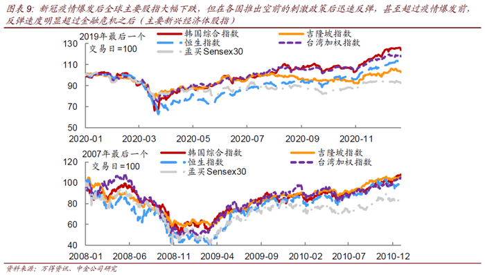 新冠疫情2月底开始在境外爆发后,全球各大股指迅速下跌,并在一个月之内(3月下旬)见底,跌至疫情爆发之前约60%的水平。3月底开始,全球股市在各国空前的刺激政策救助下迅速反弹,目前,在距疫情爆发10个月后,全球股市就已基本恢复元气,巴黎CAC40指数、法兰克福DAX指数和富时100指数已接近疫情前的水平,标普500指数和日经225指数甚至已经高于疫情爆发之前;此外,主要新兴经济体的股指也大多回升至超过疫情前的水平。而金融危机时,即使从2008年9月形势开始失控算起,全球股市也经过近6个月的时间才见底,跌至2008年初约一半的水平。此后经过近2年的时间,才缓慢恢复至接近2008年初的水平,且德国、日本、印度等股市仍处于相对低迷的状态。因此,此次疫情后全球股市的回升速度和斜率都明显大于金融危机时期。