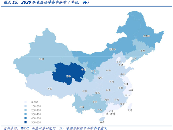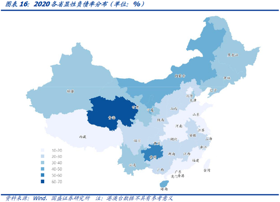 从显性负债率来看,同样地方财力薄弱省份承压明显,高债务率省份和高负债率省份重合明显。2020年全国31个省、自治区、直辖市中,显性债务率超过30%共计12个省份,显性负债率压力较高的是青海(69%)、贵州(57%)、宁夏(44%)、内蒙古(42%)、海南(41%)、吉林(36%)、新疆(36%)、辽宁(35%)、天津(35%)、甘肃(35%)、云南(34%)、黑龙江(34%),均为地方财力薄弱省份,并且该12个省份中除去天津和海南,另外10个省份均为债务率最高的10个省份。显性负债率最低的是广东(11%)、北京(14%)、河南(14%)、西藏(15%)、江苏(15%)、上海(15%),除西藏以外均为2020综合财力排名前十的财政大省。