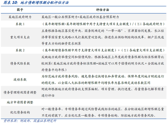 各省地方债额度分配采用“正向激励”的原则。各省新增地方债限额由财政部评估之后层层下达,虽然具体分配公式较为复杂。但经我们测算,省级综合财力是最主要的决定指标,大概能够解释73%左右的新增地方债规模。这显示财政在分配各地政府债务增量时主要考虑了各地的偿还能力。除此之外,重大项目占比、债务风险状况也是考虑的因素。一般债务风险高则可能得到较低的新增债务限额。