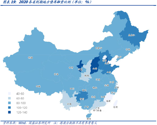 从再融资占到期比重,看当下各省可偿还财力。再融资一般用于偿还从到期地方债部分本金,即采用借新还旧的方式,缓解地方政府当下的偿债压力。到期债务进行再融资的比例越高,往往代表当下地方可偿还财力不足。从2020年再融资发行占到期规模来看,当下可偿还财力严重不足的6个省份为天津(138.1%)、宁夏(135.6%)、山西(127.4%)、贵州(110.3%)、山东(105.5%)、河北(100.7%),此外黑龙江、辽宁、吉林、安徽、内蒙古、重庆、甘肃的再融资比例也高达95%-100%。