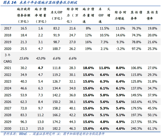 按照2017-2020增速进行简单线性外推,2023年地方显性债务率突破120%的绝对上限、2030年显性负债率达到60%国际警戒线。基于2017-2020年数据,我们提出以下四个假设,对未来地方政府债务风险进行压力测试:第一,2021年地方政府债净增量预计为4.73万亿左右,与20年基本持平;第二,基数效应下,2021年名义GDP增速、综合财力增速分别为11%、8%;第三,2021年后GDP增速、综合财力增速增速以2017-2020年CAGR为基础,并逐年下降0.25个百分点;第四,2021年后地方债余额以2017-2020年CAGR为基础,保持同比15.6%的增速.。测算结果显示,首先到2023年地方政府显性债务率达125.8%突破国际通用绝对上限(120%),其中地方政府债务余额将达到40.3万亿,综合财力32.1万亿。随后,到2030年,地方政府显性负债率达61.1%,首次突破国际通用警戒线(60%),其中地方政府债务余额达到111.3万亿,名义GDP为182.1万亿。