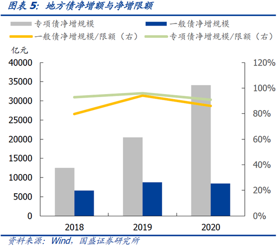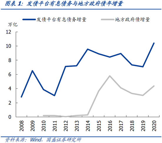“开正门”成为地方政府越来越重要的债务来源。在堵偏门的同时,地方政府正门则开的越来越大。2020年面对新冠疫情冲击,预算确定新增一般地方债0.98万亿,新增专项地方债3.75万亿,合计新增4.73万亿,较上年多增1.68万亿元。开正门成为越来越重要的地方政府债务来源。如果用城投平台有息债务来表示地方政府隐形债务,用地方政府债表示地方政府显性债务。则显性债务占总债务的比例已经从2014年2.4%的低比例提升至2020年20.7%的水平,2020年地方政府债净增4.37万亿,而当年上半年城投有息债务增加8.2万亿,考虑到下半年货币环境变化,假定城投有息债务同比增速在2020年末回到2019年末和2020年中的均值,估算2020年全年城投有息债务增加10.4万亿。因而,从增量上看,地方债已经占到地方政府总债务增量的三成以上。地方政府债已经成为地方政府越来越重要的资金和新增债务的来源。
