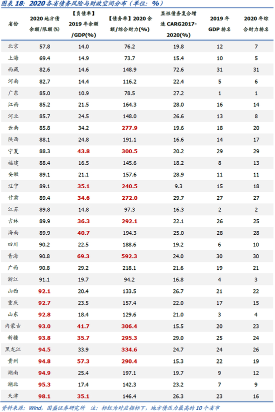 各省显性债务风险如何?2020年地方债务余额占全年地方债限额的88.4%,尚余3.36万亿往年留存余额,主要分布在经济发达,财力较为充足省份。我们按照债务率、负债率、地方债余额/地方债限额三个指标可以将31个省份简单分为五档:地方债压力最大省份表现为高债务率、高负债、低地方债留存余额,包含贵州、新疆、内蒙古;负债率、债务率双高省份,包括青海、吉林、甘肃、辽宁、宁夏;高负债率、低留存余额省份,主要为天津;债务率、负债率较低,但留存余额不足省份,包括湖北、湖南、黑龙江、山东、重庆、山西。按照到期债务再融资比例来看,当下偿债财力明显不足省份为天津(138.1%)、宁夏(135.6%)、山西(127.4%)、贵州(110.3%)、山东(105.5%)、河北(100.7%),此外黑龙江、辽宁、吉林、安徽、内蒙古、重庆、甘肃的再融资比例也高达95%-100%。可以明显看到,财力越弱的地区,对地方政府债依赖度越高,而财力较强地区,地方政府债能够使用的空间更大。