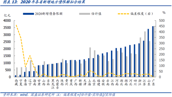 实施上,新增地方债限额分配主要参照地方财力,偿债风险指标并不显著。我们将公式中“[该地区财力×系数1+该地区重大项目支出×系数2] ”理解为融资需求基数,其他为调节因子,不难发现:(1)新增地方债务限额用于满足重大项目和非重大项目资金缺口,其中非重大项目部分主要通过考核地方财力确定新增地方债基数。而重大项目部分基数为重大项目支出额度,这部分不需要考察地方财力,这也基本符合近几年中央经济工作会议确定的“增强国家重大战略任务财力保障”的表态(2)调节因子主要目的在于债务风险防范。我们以2020年新增地方债限额为因变量,以表征综合财力和债务风险的指标:2019年综合预算财力、2019年末债务率、2019年初负债率为自变量,进行简单线性回归。回归结果显示:R^2为0.73,模型具有有效解释力度,但是三个自变量中只有表征综合预算财力的指标显著,而表征偿债风险的债务率、负债率并不显著。